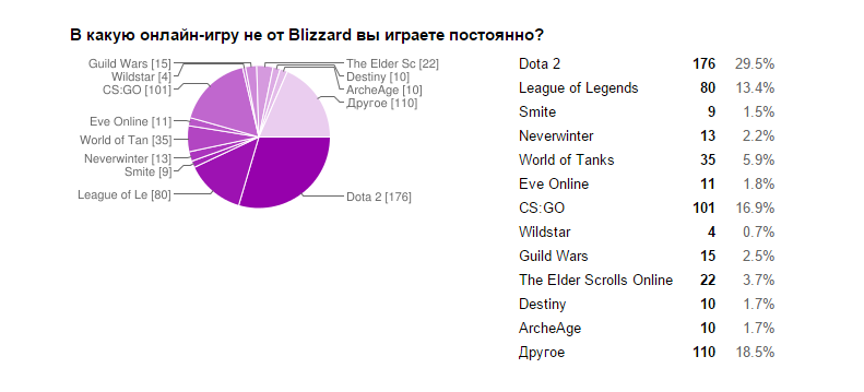 В пунктe «Другое» небольшое количество читателей (около 20 человек), отметили «не знаю» или «только WoW». Остальные указали несколько игр, в список которых попали TERA, ArcheAge, Aion, Battlefield 4, Borderlands 2, Bloodborne, No Man’s Sky, War Thunder, либо все предложенные варианты сразу.