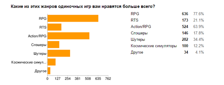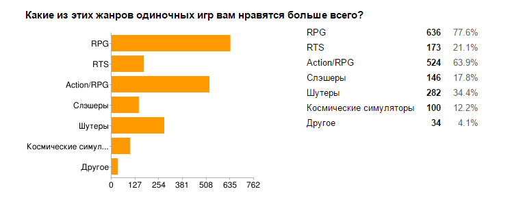 Самые популярные MMO-жанры на сайте (опять же, согласно опросу) – MMORPG и MOBA, а одиночные – RPG и Action/RPG. Самые интересные сеттинги – фэнтезийные (86,7%), научно-фантастические (52,8%) и исторические (38,5%).