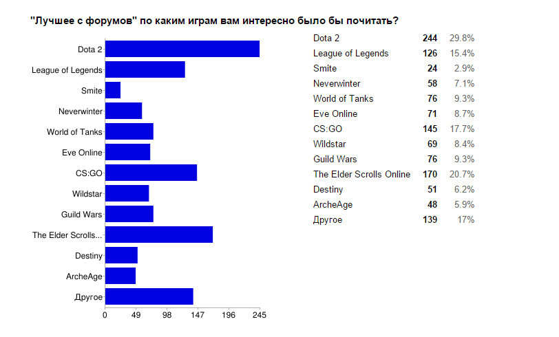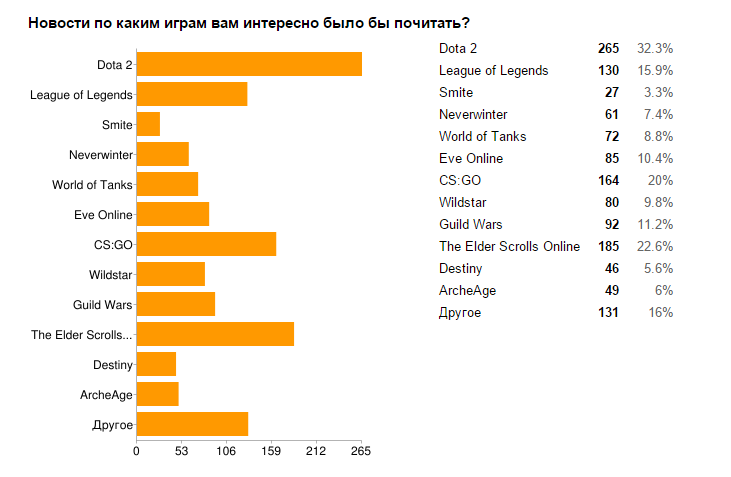 Участники опроса отметили, что им интересно было бы почитать новости и обзоры по четырем играм: Dota 2, «Лиге легенд», CS:GO и The Elder Scrolls Online. В рейтинге они набрали примерно по 30%, 15%, 17% и 20% соответственно. Это основные игры-лидеры.