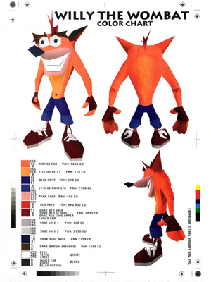 Цвет бандикута был оранжевым и он был выбран не случайно, или потому что понравился разработчикам, в этом был куда больший смысл. Проблема в том, что многие имели старые телевизоры, которые отображали некоторые цвета не в лучшем виде. Например красный цвет имел свойство сильно "кровоточить", из-за чего на него смотреть было почти невозможно. Так же перед выбором цвета персонажа, разработчики перебрали все фоны в игре, что бы убедится, что персонаж будет всегда выделяться на них, а не сливаться с ним, как например это случалось с Соником в подводных уровнях.