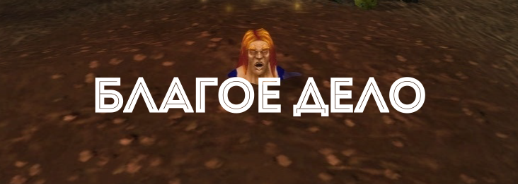 Минутка черного юмора. Мне всегда нравились квесты такого рода у Blizzard. Я люблю необоснованную жестокость в играх и кино, это весело. В квесте Благое дело нас просят спасти 15 "прорастающий людей", которые закопаны по самую голову в землю. Эти люди стали таким себе огородом для вурдалаков, которые периодически приходят подкрепиться. Чтобы выполнить квест, нам выдают чудесную лопату с отличным описанием. И тут перед вами встаёт выбор: выкапывать людей или убивать их. Всё дело в том, что в зависимости от нажатой кнопки мыши лопата выполняет 2 разных действия: сносит голову с характерным звуком или выкапывает человека. Когда я расшибал всем головы, в один прекрасный момент один из людей сам вскочил из ловушки и с криками "Он всех их убил" побежал прочь. После сноса нескольких голов вы получите бафф с отличным названием — Вынос мозга с припиской: "Возможно, теперь вы иначе будете понимать значение слова "благое".
