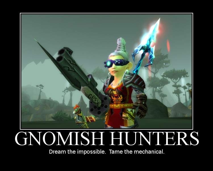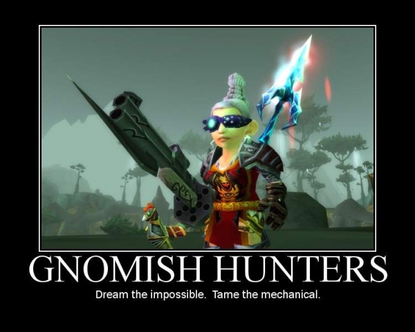 Гномы любопытные и умелые создания. Среди них ведь есть и воины, и чернокнижники, а теперь даже жрецы. Не смотря на их отношение к вере и богам. Так что гном-охотник в принципе вполне возможное сочетание. Может кто-то скажет «гномы механики, а не животноводы», « у гномов не та выживаемость», «зверь скорее съест гнома, чем будет приручен им». То, что этого сочетание не было, не значит, что оно не имеет право на существование к тому же оно не так специфично как таурен-паладин или дворф-чернокнижник, по мнению некоторых.