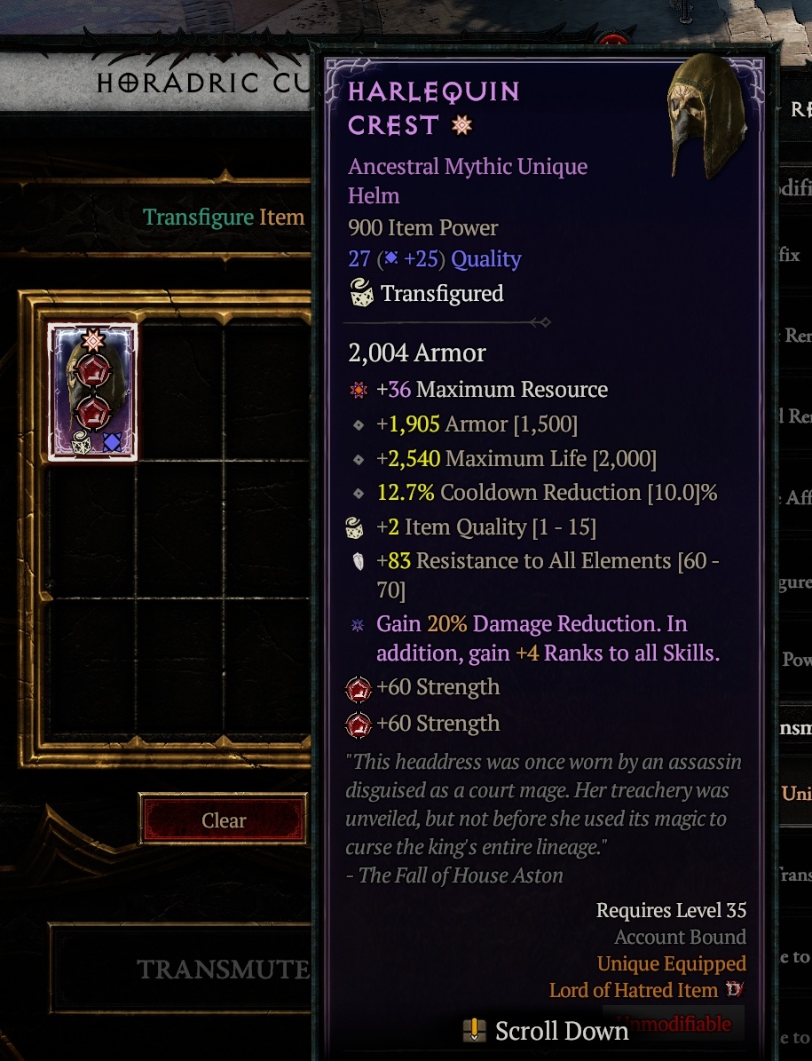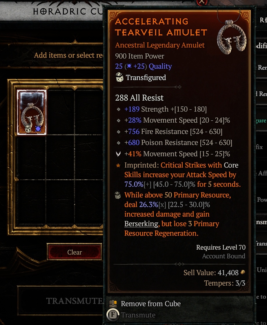 Хорадримскому кубу можно было бы посвятить несколько разделов, но самое заметное — это Трансфигурация. Игроки, знакомые с 11-м сезоном, могут называть это Освящением, и видеть его снова в полную силу в кубе было все равно что встретить старого друга: тепло, знакомо и заманчиво. Трансфигурация сама по себе придает огромную глубину системе предметов Diablo 4, позволяя повышать качество предмета, добавлять интересные характеристики или даже бонусный легендарный аспект на ожерелье.