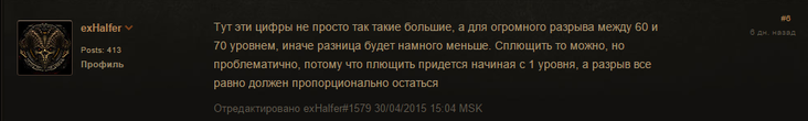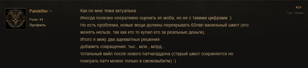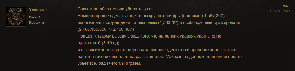 Игрок Vendico также отметил: нули убирать не обязательно, но предложил другой вариант сокращения цифр — по тысячным, которое отмечается латинской буквой K. По его мнению, сейчас урон в Diablo 3 растет адекватно и пропорционально развитию персонажа, поэтому делать сплющивание не имеет смысла.