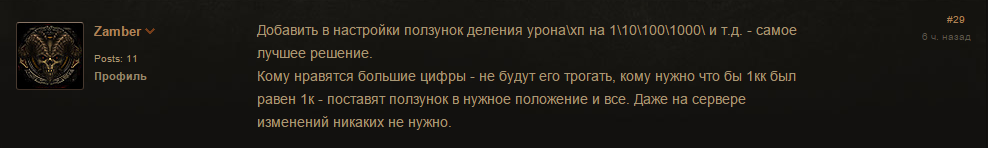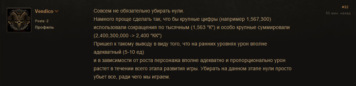 Один из игроков предложил добавить сокращение цифр в настройки. Он считает, что это позволит учесть предпочтения разных игроков, а также сэкономит время разработчикам, потому что им не придется пересматривать значения урона для всей игры.