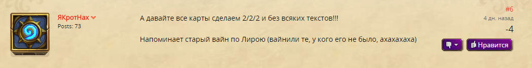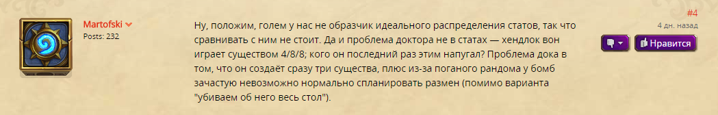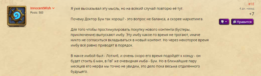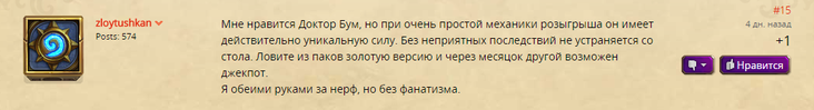 «Я не пойму, вроде бы суть легендарок не в том, чтобы они были имбовыми и лучше обычных карт, а в том, что они должны быть особенными», — написал игрок на форуме. – «Но либо я слепой, либо Blizzard тупые, очевидно, что доктор Бум — имба. Просто сравните с големом за 7 маны. Те же 7-7. Но! Бомбы доктора Бума — механизмы, следовательно, их можно забафать. Имеют характеристики 1-1, в сумме 2-1 (здоровье суммировать глупо), но кроме этих двух единиц халявного урона, после смерти они еще наносят 1-4 ед. урона».