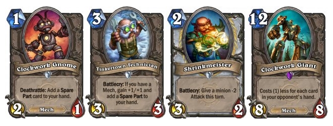 Если вы знакомы со вселенной Warcraft'a, тогда вы скорее всего знаете, чем похожи между собой гномы и гоблины, помимо низкого роста. У обоих есть страсть к изобретениям. Большинство из них конечно же классные, но у некоторых есть просто невероятный потенциал. Конечно, если они не взорвутся у вас перед лицом. Переводя на формат Hearthstone, это значит, что у нас есть новый тип карт — механизмы.Как и говорится в названии, механизмы являются новым типом механических миньонов, которые получают огромные бонусы при взаимодействии с другими механизмами. Некоторые становятся сильнее, если другая карта их вида так же в игре, другие снижают стоимость маны последующих механизмов. Другой элемент, который отличает этих существ от других — запасные части.