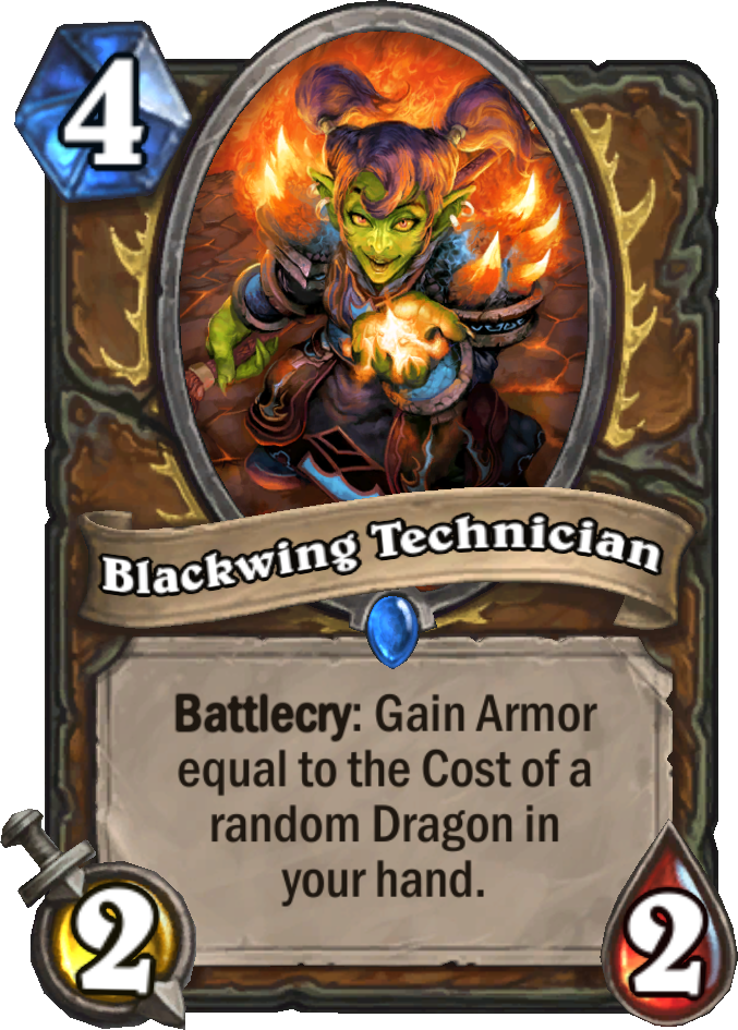 Техник предназначен для колод, где основа — драконы, и имеет стандартные, классические характеристики — 2/4 (3 маны). Но если у вас на руках есть дракон, то техник получает усиление +1/+1. Такая карта может показаться простой, и готовой к релизу, но, как показывает дизайнерская документация Blizzard, техник был не один раз пересмотрен и переделан, пока не стал таким какой он есть. По сути Team 5 протестировала десять различных версий этой карты, которые значительно отличались друг от друга.