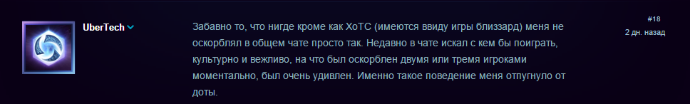 Автор темы написал, что по его наблюдениям ругаться матом в общих чатах и «вообще вести себя как попало» стало очень модно и предложил ограничить их использование: «Рассадником всего этого я считаю Dota, поскольку никогда ранее в World of Warcraft не было этой бесконечной ругани. Теперь все это перетекает в HotS».