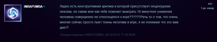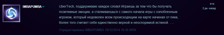 Рассмешил парняга, который считает, что мат нормальное являние в речи взрослого человека. Особенно фраза "20+ лет побитые жизню дядки", лол. Не думал, что я уже дядька :) И вообще мне кажется, что он немножко перепутал цифры и вместо стажа игры написал свой возраст :)
