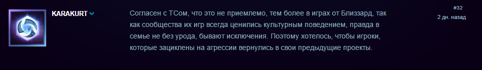 Другие поддержали автора темы отметив, что ранее в играх Blizzard никогда не сталкивались с оскорблениями в общем чате без повода, и предложили игрокам, не отличающимся хорошим поведением, вернуться в свои предыдущие проекты.