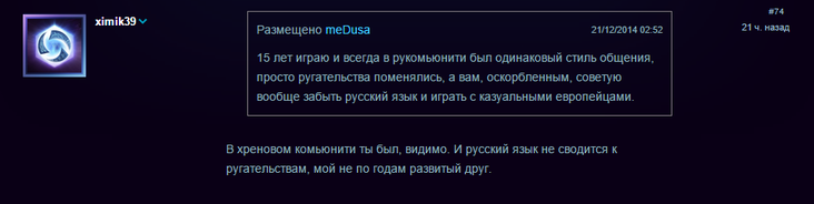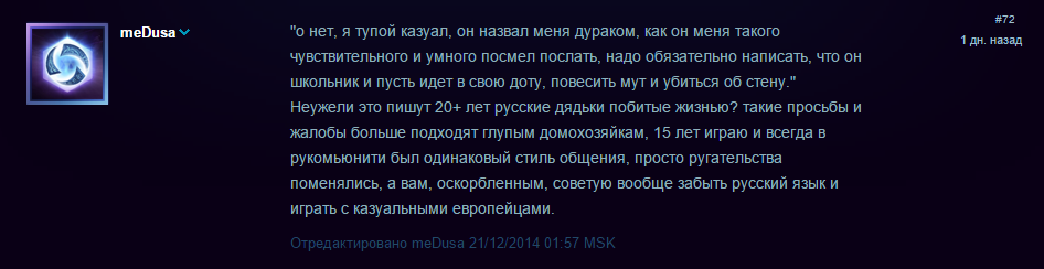 Пользователь meDusa посчитал, что игроки стали слишком мягкотелыми, и с учетом того, что русскоязычное сообщество в интернете всегда отличалось сниженным стилем общения, игрокам нужно либо смириться, либо начать играть с европейцами.