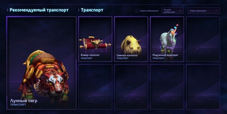 Некоторые транспортные средства становятся доступны на ограниченное время и потом перестают быть доступны для приобретения, такие как Скакун Нексуса для посетителей BlizzCon 2014, или Звездочка для тестеров, которые вложили в игру деньги еще на этапе тестирования. Золотого тигра можно получить только купив коробку с Heroes of the Storm, но не стоит путать его с лунным тигром, которого можно купить в магазине.