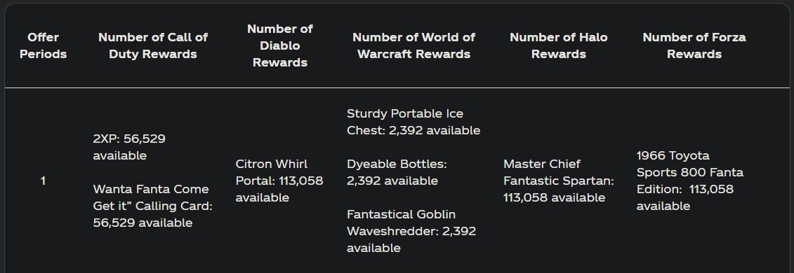 На каждую неделю из 17-недельной акции доступно всего по 2 392 единицы каждой из наград WoW. Это означает, что за все время проведения акции участникам будет доступно немногим более 40 000 средств передвижения. В резком контрасте с этим, награды из других игр имеют значительно большую доступность: более 113 000 штук каждую неделю, включая портал «Лимонный вихрь» из Diablo 4 (почти 2 миллиона за всю акцию).