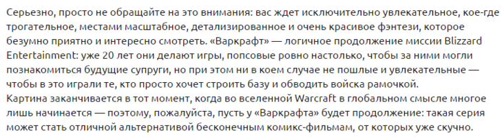 Фильм получился 10/10 и с многолетним опытом игры в Вов, я шёл туда смотреть офигенный фильм по любимой игре, а не искать где по лору листок на дереве висит с левой стороны или правой.