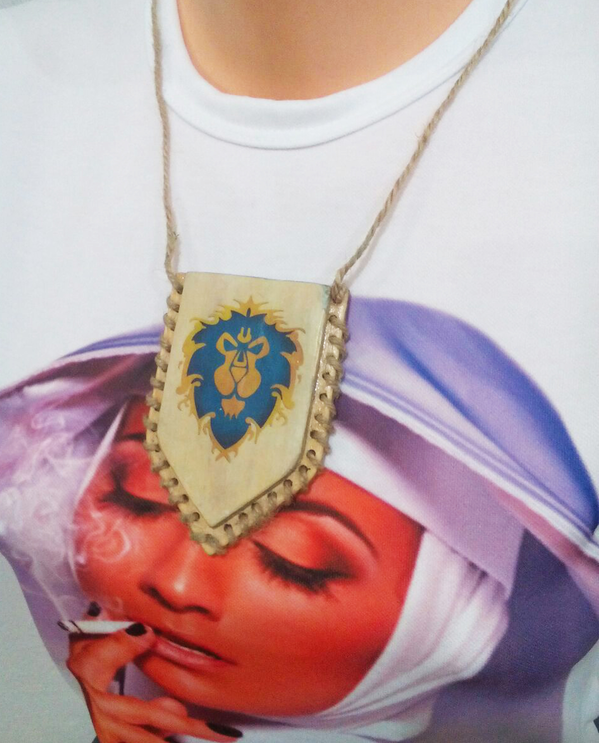 Подобрав бечевку заплетаем ее в подготовленные нами ранее отверстия, не забыв отставить запас чтобы одеть на шею. Плести можно несколькими вариантами, можно использовать два вида веревки и плести через одно отверстие, мы же остановились на самом доступном варианте.