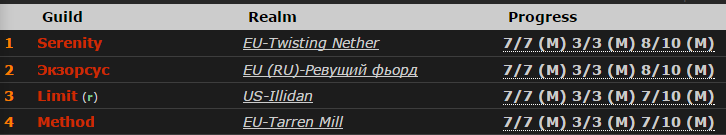 На данный момент в рейдовой гонке за первое в мире убийство эпохального Гул'дана лидирует Serenity, убив 8 боссов. С тем же показателем убийств, на втором месте российская Экзорсус, далее американская Limit и только на 4 месте, с 7 убитыми эпохальными боссами идет Method. Если фанаты Serenity и исполняли атаку на Tarren Mill, то это точно подействовало.