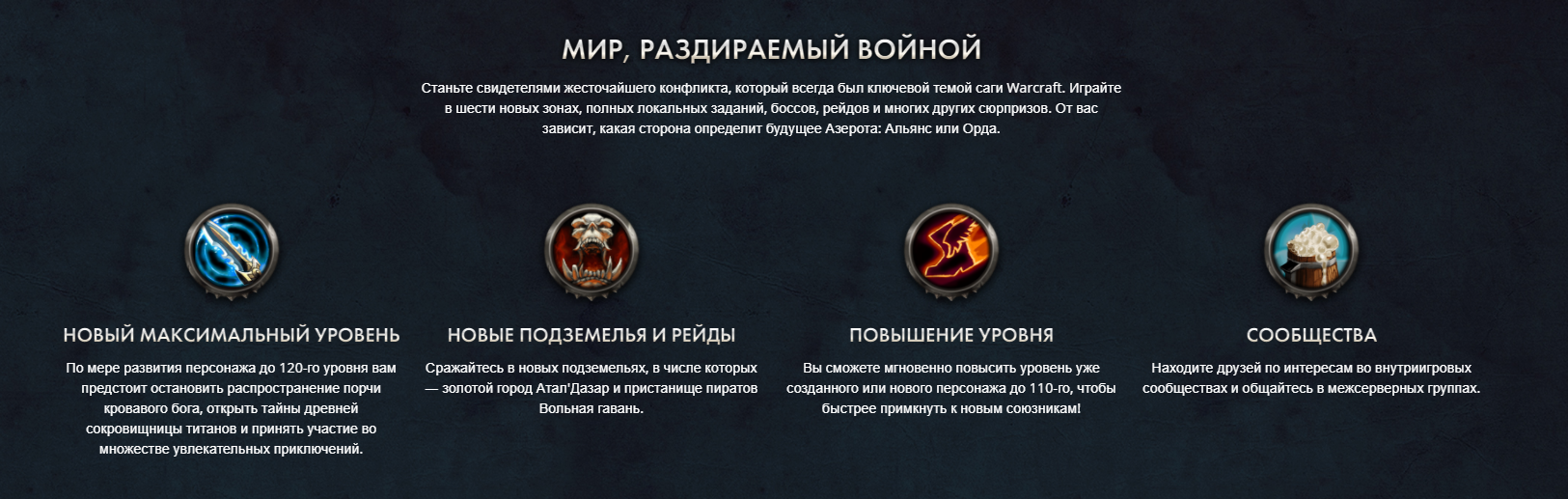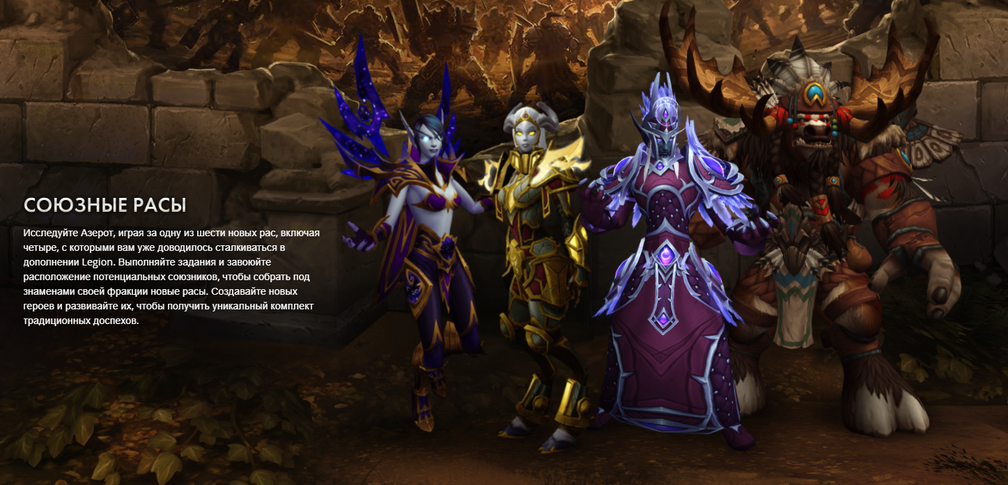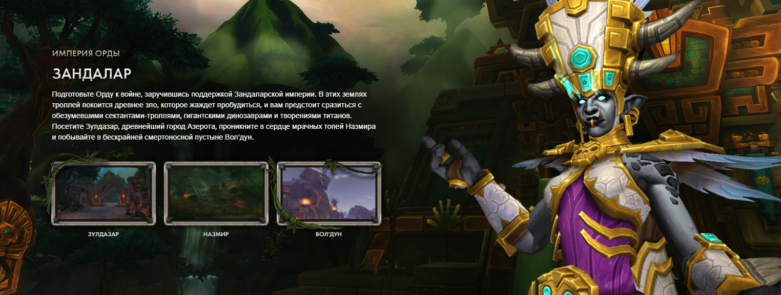 Два новых континента — Кул'Тирас и Зандалари. Прокачка до 120 уровня. Новые подземелья и рейды. Союзные расы.