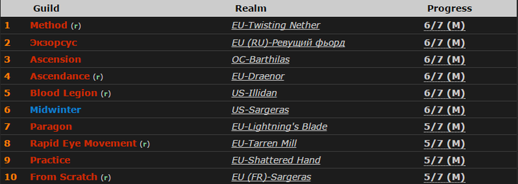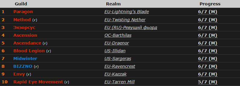 Гильдия до сих пор не убила Мясника – его прошли все остальные команды, участвующие в рейдовой гонке - Method, «Экзорсус», Ascension, Ascendance, Blood Legion, Midwinter, BLIZZNO и Envy, но теперь находится в топе мирового рейтинга.