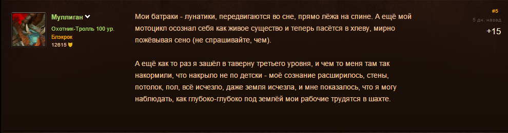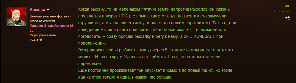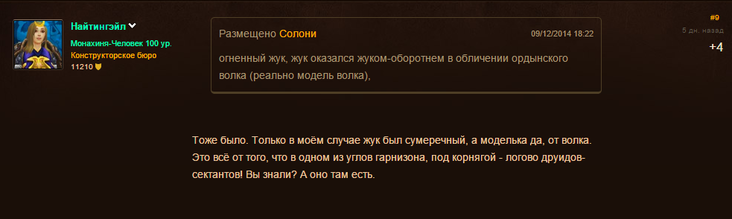 «Через несколько дней я зашел в ратушу и почувствовал неладное, за мной наблюдал мой пет — огненный жук. Жук оказался жуком-оборотнем в обличье ордынского волка (реально модель волка), я стал медленно пятиться к выходу, жук за мной, я выбежал на улицу, быстро сел на маунта и побежал. Жук гнал меня до самых ворот и в конце как привидение растворился в локации», — рассказал автор темы, Солони с Гордунни.