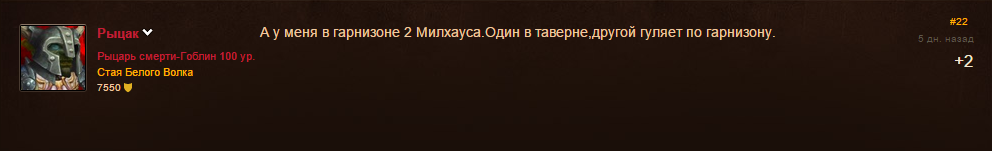 Соратников никогда не бывает много, и у рыцаря смерти с Вечной Песни по гарнизону расхаживают сразу два Милхауса Манашторма. Пока один занят делами, другой отдыхает в таверне. Хитрый гном!
