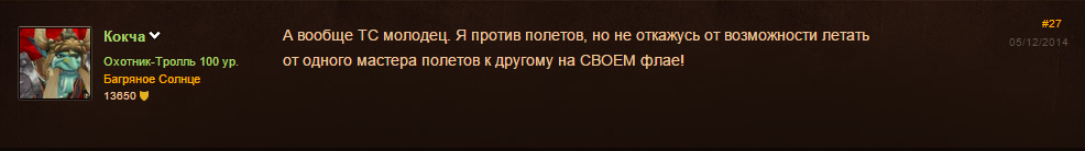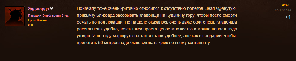 «Чувствуешь себя лохом, которого развели на коллекционку, — написал Лоасупа. — Если б они написали "Вводим новую крутую фишку — отменяем полеты, возвращаем дух исследований! И так на весь аддон!", у меня не было бы никаких претензий. Можно обходиться без маунтов, играть и получать удовольствие».
