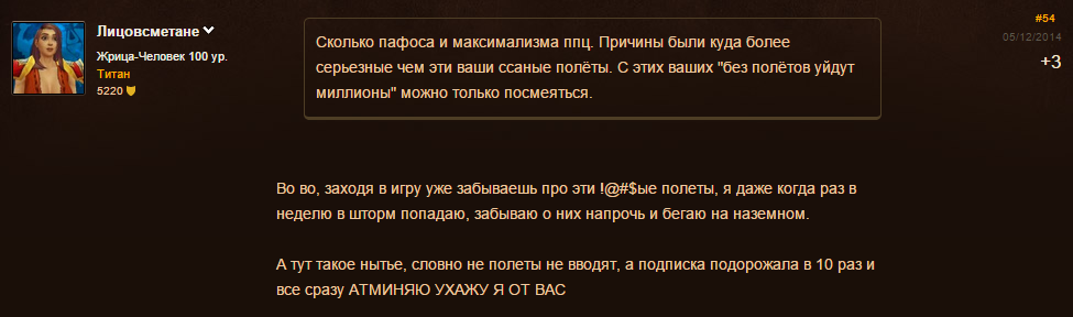 «Когда я предзаказывал WoD, то нигде: ни в рекламе, ни в процессе заказа не было сказано, что в аддоне не будет полетов. Напротив, с каждой картинки на меня смотрел флай-маунт, идущий бонусом за коллекционное издание. Учитывая этот факт, а также то, что на протяжении 8 предыдущих лет полеты были одной из самых базовых фич игры, я оформил предзаказ, не подозревая о том, что меня ждет. Нехорошо так делать, Blizzard», — написал автор темы, рыцарь смерти Ripley с сервера Hellfire на форуме и отметил, что больше не видит смысла продлевать подписку.