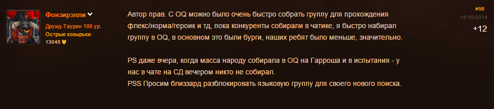 «То, что сделала Blizzard — неработоспособно. Потому что из-за ограничений по языковому региону новая система поиска рейда будет работать только в EU группе и то, в урезанном виде. В RU и прочих закладках система не работает, потому что онлайн в большинстве национальных групп ограничивается жизнью на одном-двух серверах на закладку, где прекрасно хватает обычного /4. Или поиска по флексу», — написал ворген Блохнету на форуме.