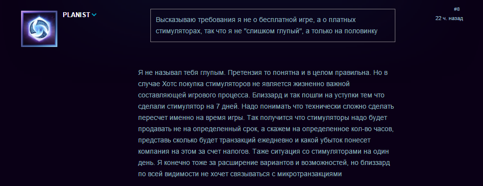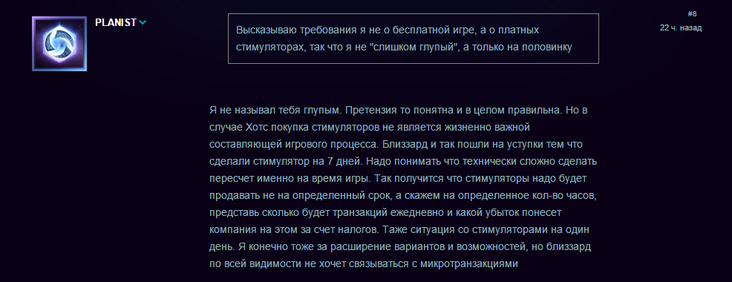 По мнению PLANIST’а, претензия автора темы в целом хоть и правильна, но сделать пересчет на время игры технически сложно. Игрок считает, что Blizzard таким образом пытается избежать микротранзакций.