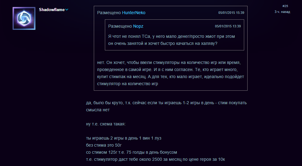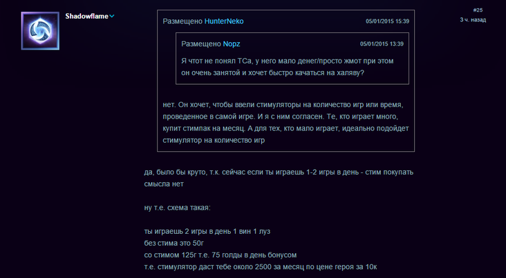 На форуме идею автора темы поддержали несколько человек. Её очевидный плюс – вы платите только за время, проведенное в игре, и здесь, вроде бы, все честно. Однако не стоит забывать, что Heroes of the Storm – бесплатная игра со встроенными покупками, то есть с китайской почасовой подпиской на World of Warcraft её уже не сравнить.