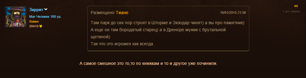 Пока Blizzard не обратила на табличку внимание, мы можем прочитать на ней теплые слова верховного мага Даларана Антонидаса в память «почившего» героя: «Никто и никогда так самоотверженно не погружался в темные глубины магии и войны. Мы желаем тебе добра, смелый странник. Где бы ты ни был».