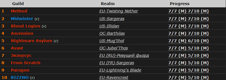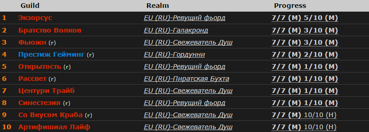 Русскоязычная «Экзорсус» находится на седьмой строчке мирового рейтинга с прогрессом 5 из 10. Последний убитый ей босс – Ка’граз Пламенная. Её освоили вечером 11 февраля.