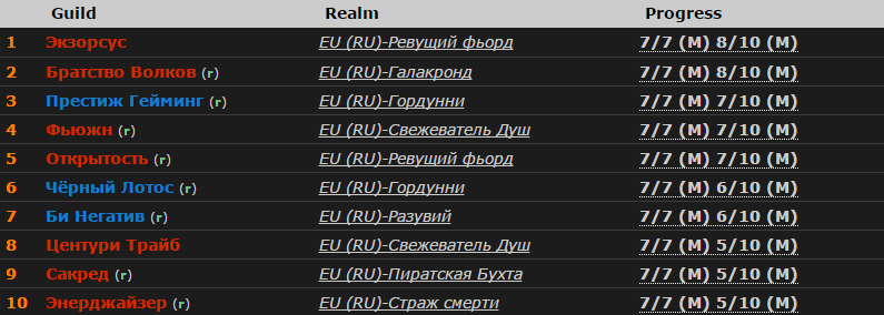 Тем временем «Братство волков» с Галакронда не желает покидать мировую двадцатку и по-прежнему остается на 17-й позиции, благодаря своевременному убийству Железных леди. Такой же прогресс (8 из 10) еще у 18 гильдий, включая вышеупомянутые.