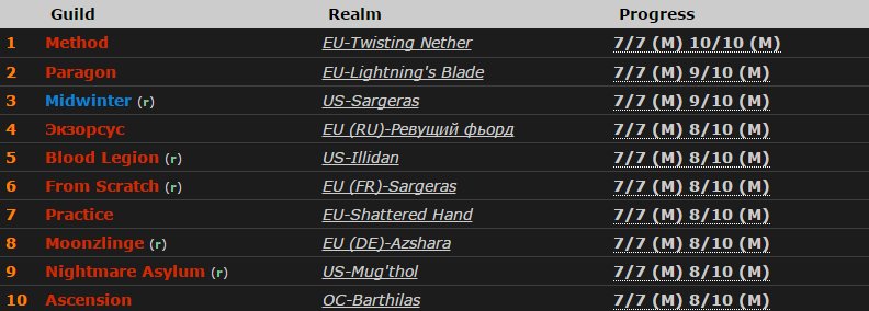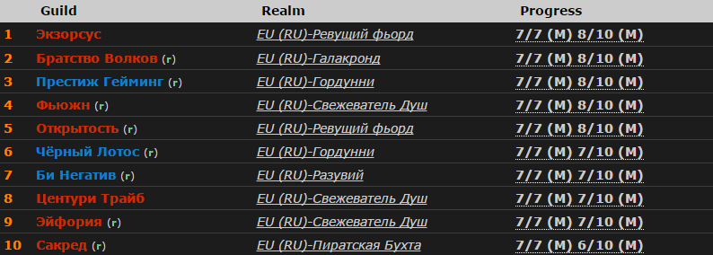 По данным WoWProgress, четвертую строчку мирового рейтинга занимает «Экзорсус» — у нее 8 убитых боссов. Затем с тем же результатом идет Blood Legion, From Scratch и Practice.