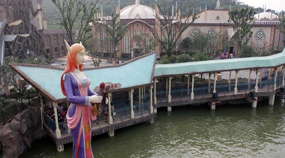 Один ресторан — это ничего, по сравнению с тем, что инвесторы построили в провинции Цзянсу. Что могут сотворить миллионы ненужных владельцу долларов и полное пренебрежение к интеллектуальной собственности в законах страны? World Joyland Play Valley — это первый в мире вдохновленный видеоиграми тематический развлекательный парк. Парк построили по инициативе организаторов China Joy, самой большой игровой выставки в Китае. Он открылся в 2011 году. Использовав образы из игр парк быстро привлек посетителей.«Магическая локация» в парке Joyland бесспорно черпала вдохновение из WoW. Создатели парка не делают никаких усилий для скрытия этого факта. Статуи и архитектура бралась прямиком из Азерота. Аттракцион, например, называется «Гордость серебряной луны», что отсылает к Кель'тасу, принцу эльфов. Другой аттракцион называется «Всплеск дьявольской крови», он проводит вас по тоннелю, полному орков.