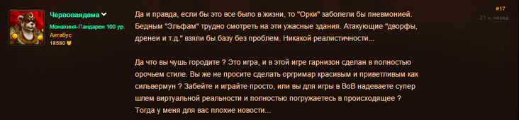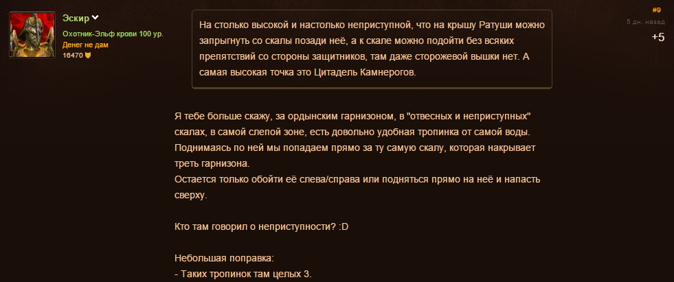 «Не будучи стратегом, я сам лично нашёл кучу удобных способов штурмовать гарнизон Альянса (не учитывая канализацию и вечнооткрытые врата). Но ордынский гарнизон: это капец. Особенно казарма, ибо там даже пола нет!», — добавил Формджин с Черного Шрама. – «76% войск умерло бы от пневмонии, усталости и переохлаждения в первый же месяц военной кампании, остальные бы сдались или дезертировали. Автор всё верно расписал, разрабы забыли что не делают тут игру по приключениям пони в пенопластовой долине».