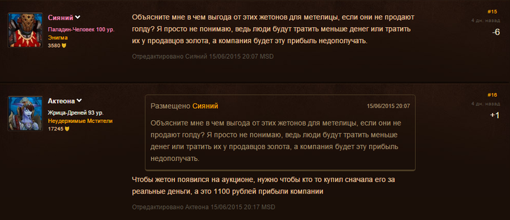 «Покупаться данные жетоны будут так же, как и жетоны с игровым временем. Что это даст? Дополнительную выгоду Blizzard и удобство для многих твинководов», — написал автор темы, маг Айди с Черного Шрама.
