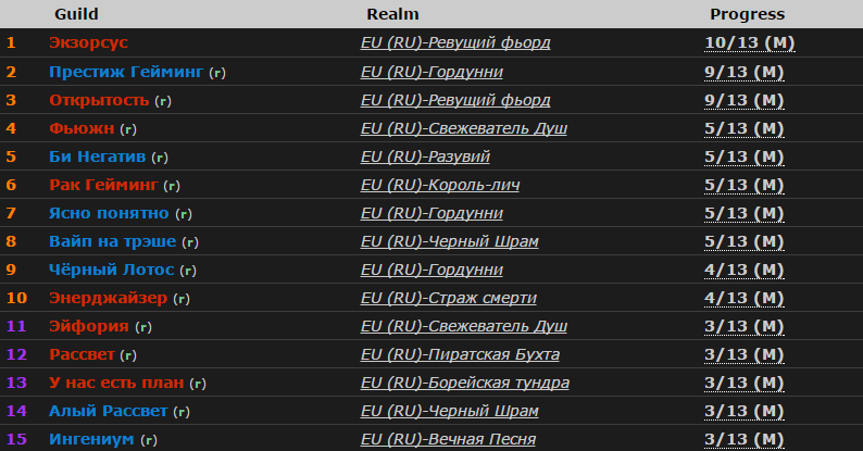 Четырем русскоязычным гильдиям удалось убить по пять боссов. В их числе «Фьюжн», «Би Негатив», «Рак Гейминг», «Ясно понятно» и «Вайп на трэше». Топ-10 русскоязычных серверов замыкают гильдии с прогрессом 4/13: «Черный лотос» и «Энерджайзер».