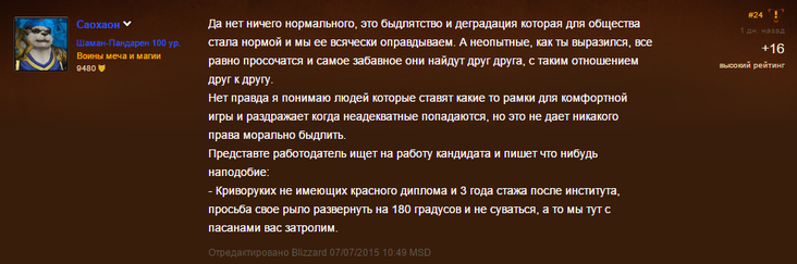 Я не заходил в вов с катаклизма. И вот близзы прислали мне 7 дней, и я решил зайти. Первое что я увидел в чате - стена мата. Я начал кликать "пожаловаться", но таких сообщений было так много, что я устал нажимать. Видимо такой стиль общения стал нормой. В общем, я нажал "выход".