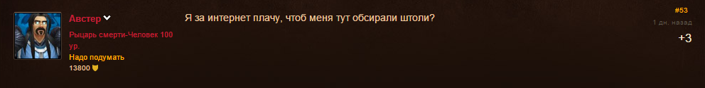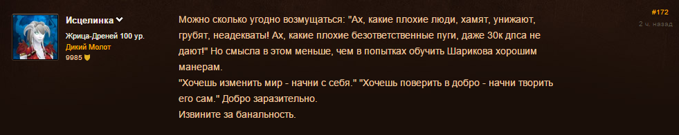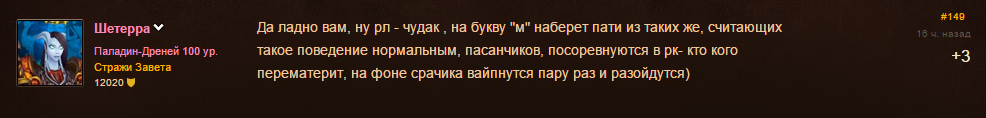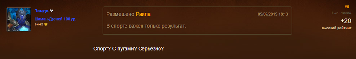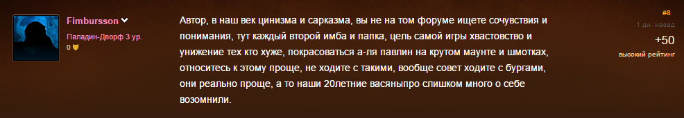 «Что творится в игре? Все друг друга пытаются принизить, не обязательно это было так по-тупому заявлять... Кого этот чувак унижать там собрался? И самое главное, как он это сделает? Поставит в угол перед Огри, с колпаком на голове, чтобы все плюнули ему в лицо, если ДПС 22к?