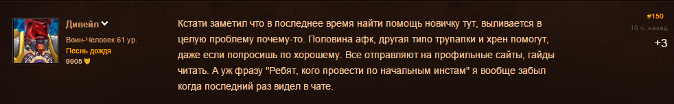 Я уверен, что большинство из них никогда не оказывало реальной помощи. Сколько раз вы тащили игрока без опыта, в актуальный рейд, не в нормал, а в героик (или теперь уже мифик)? Когда сам ведёшь Рагну в корни, что-бы он не убил рейд 1 ударом, а сам в скайпе паралельно объясняешь где стоять этому новичку, что-бы не вызвать гейзер, потому что он не знает тактики. Когда рл говорит, что берёт тебя, а новичёк ему не нужен и ты ставишь ультиматум - либо оба, либо никто. Когда просто целое кд поришь из-за человека, которого встретил вчера? Часто ли вы 3 часа стоите у маникена, с нубом, и с 0 рассказываете ему его ротацию, отрабатывая её часами? Бывало ли у вас такое, что вам стало жалко гильдию, которая к лету закрыла только Малкорока хм и вы вступаете что-бы им помочь, хотя сами всегда рейдили пугом?