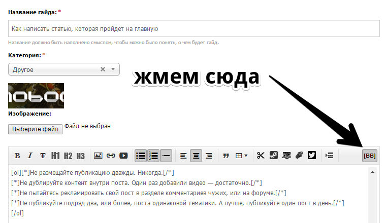 - Пишите в bb-редакторе — так проще. Он включается вот так: