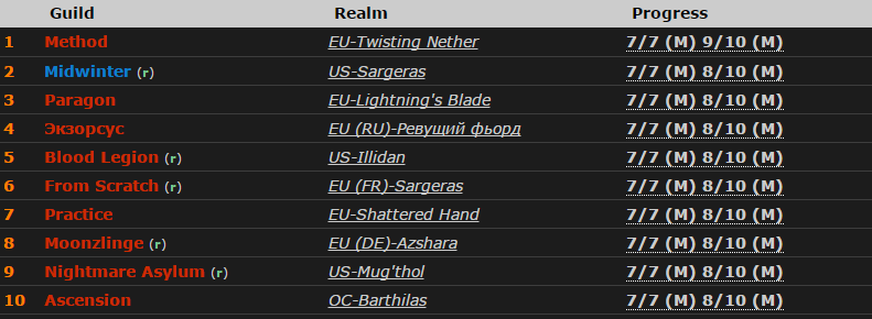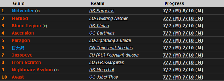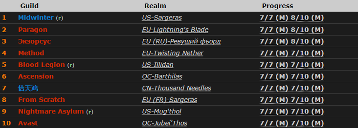 Такой же результат – еще у девяти гильдий, поэтому точно предсказать, кому будет принадлежать второе убийство сложно. Тем не менее, высокие шансы в ближайшее время освоить девятого босса у Midwinter, Paragon, Blood Legion и «Экзорсус». Финская гильдия, убив Железных леди днем 13 февраля, начала траи Горнила примерно на полтора часа позже Midwinter и на сутки раньше последних двух команд.