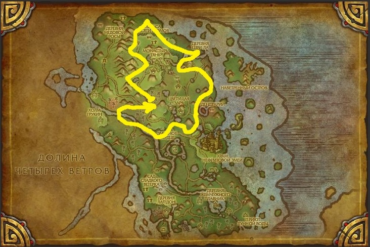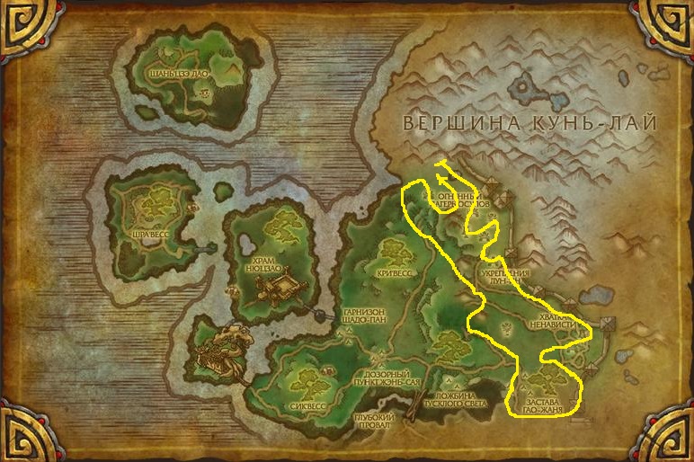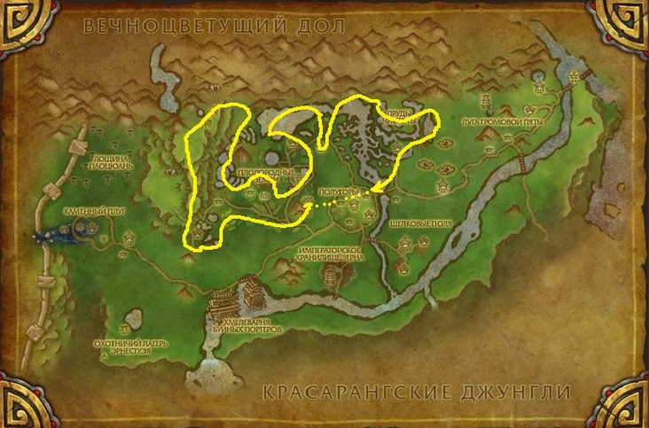 Собственно лучшее место добычи, если Вы не 90 уровень. Хотя и маршрут был сделан для игрока который уже может летать в Пандарии, но тут есть всего несколько мест куда надо взлетать на маунте, так что думаю это не составит трудностей для игроков ниже 90 уровня.