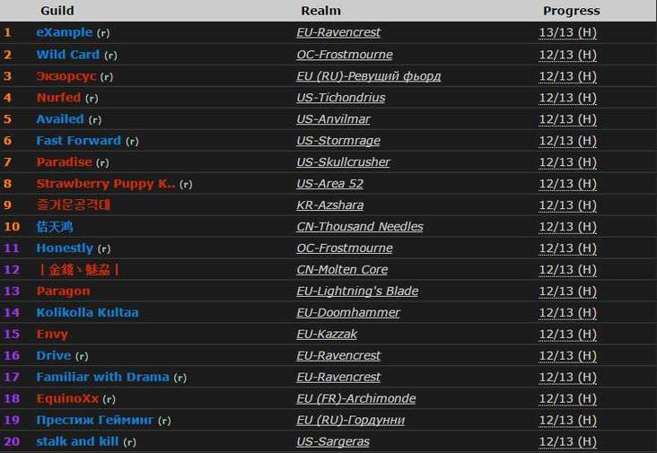 Первое место заняла гильдия eXampleс сервера Ravencrest. Среди русскоязычных гильдий лидирует «Экзорсус» (3 место), так же в топ 20 попала гильдия «Престиж Гейминг».